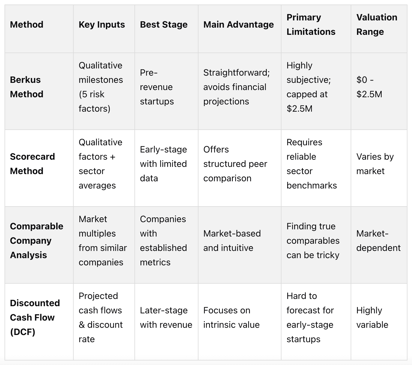Each method serves different purposes depending on the stage and data available. The Berkus Method, for instance, is perfect for pre-revenue startups, relying solely on qualitative milestones. The Scorecard Method adds a layer of comparison by incorporating sector averages, making it suitable for early-stage ventures. For companies with established metrics, Comparable Company Analysis provides market-driven insights, while DCF is best suited for later-stage businesses with predictable revenue streams.