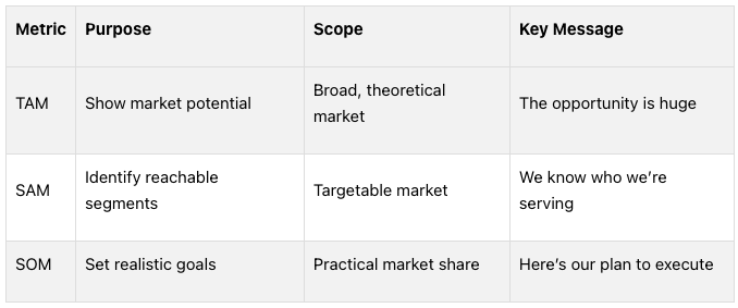 TAM, SAM, and SOM are critical metrics that help startups clearly outline their market potential and communicate it effectively to investors.