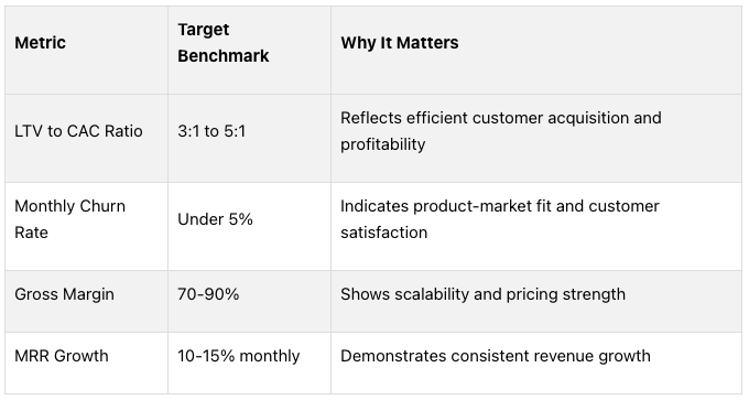 For SaaS startups, benchmarks are especially important. Investors typically expect 10-15% monthly MRR growth for early-stage companies and a monthly churn rate under 5% [40]. These figures signal strong performance and customer retention.